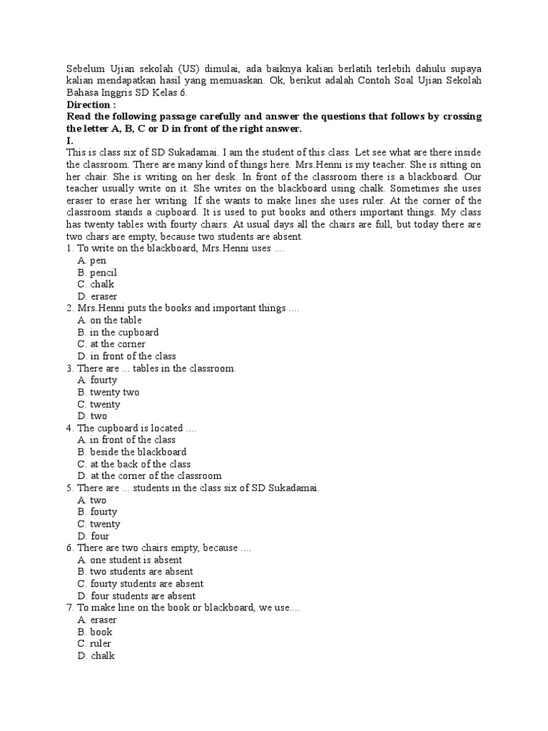 Contoh Soal Ujian Sekolah Bahasa Inggris Sd Kelas 6