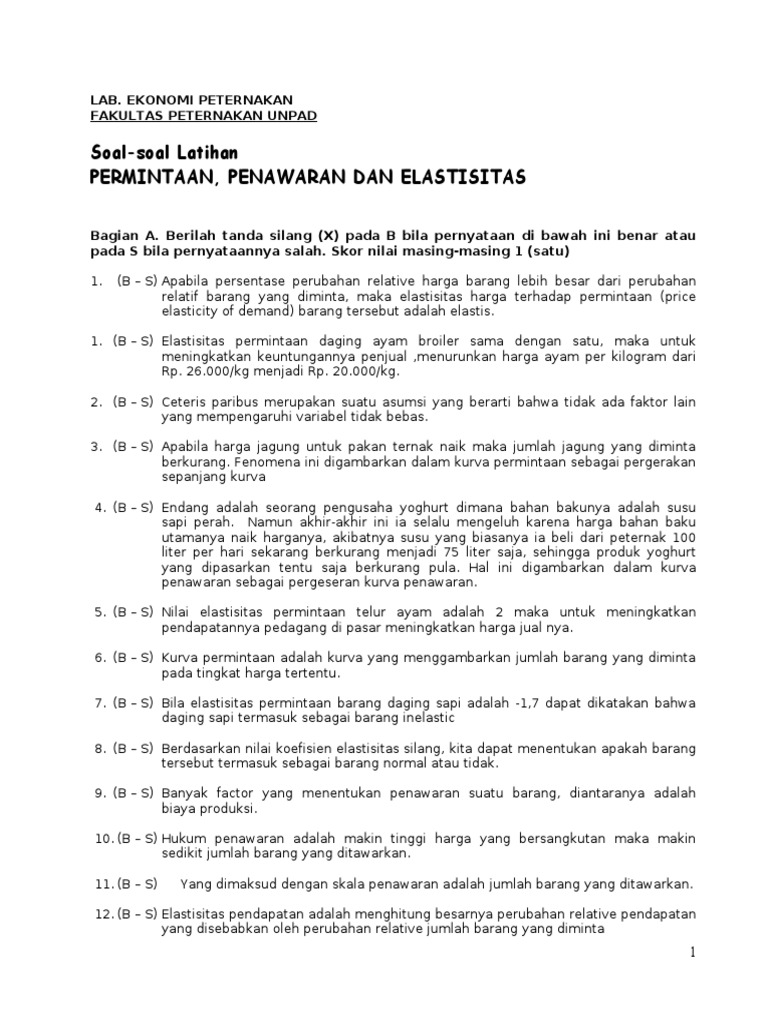 Soal Soal Latihan Permintaan Penawaran Dan Elastisitas