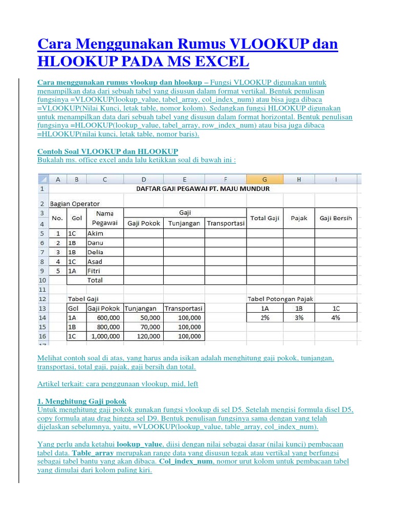 Fungsi vlookup atau rumus vlookup merupakan salah satu fungsi atau rumus excel dasar yang sering sekali digunakan. Mulai dari versi lama sampai versi terbaru. Melihat contoh soal di atas yang harus anda isikan adalah menghitung gaji pokok tunjangan transportasi total gaji pajak gaji bersih dan total.