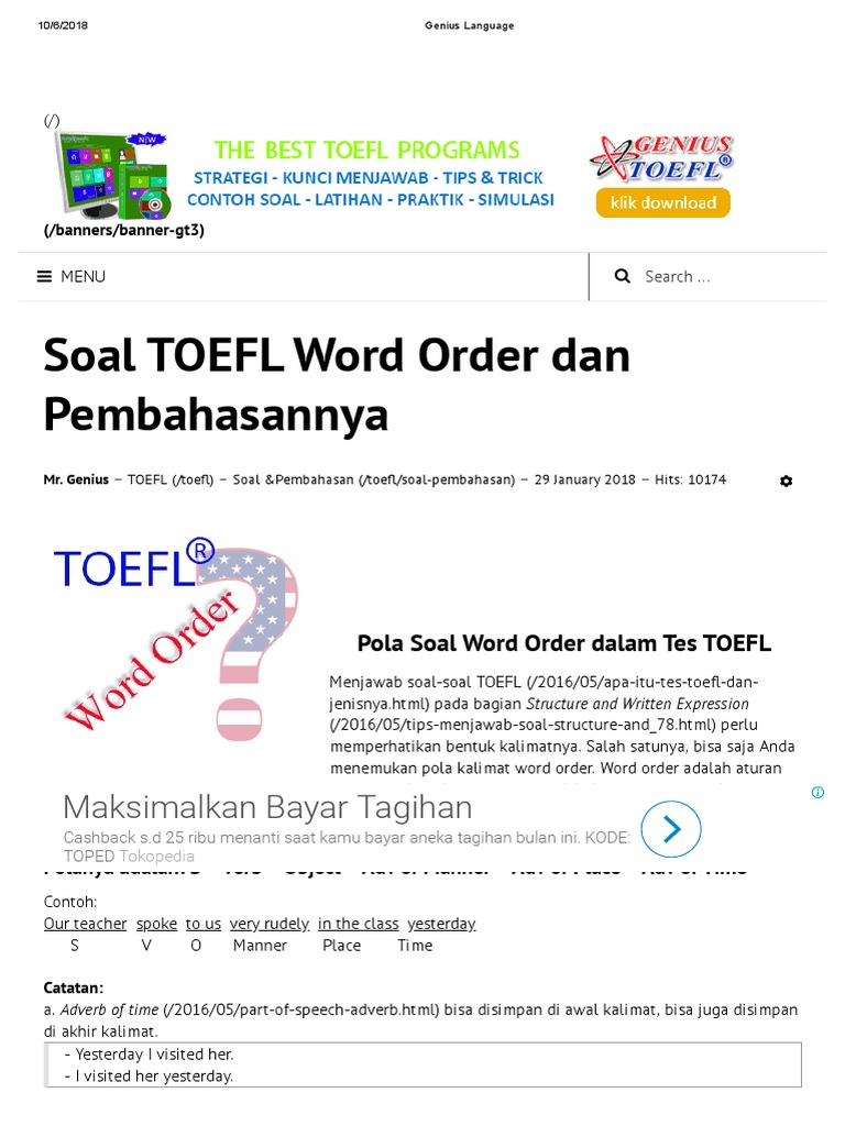 Contoh soal toefl word order dan pembahasannya 1. S v o susi menyukai kucing jojo cooks fried rice. Contoh file soal uts lengkap kelas 1 6 sdmi semua mata pelajaran 20162017 berikut ini adalah kumpulan dari berbagi sumber tentang contoh soal word order smp yang bisa gunakan untuk bank soaldownloadsd dan diunduh secara gratis dengan menekan tombol download biru dibawah ini.