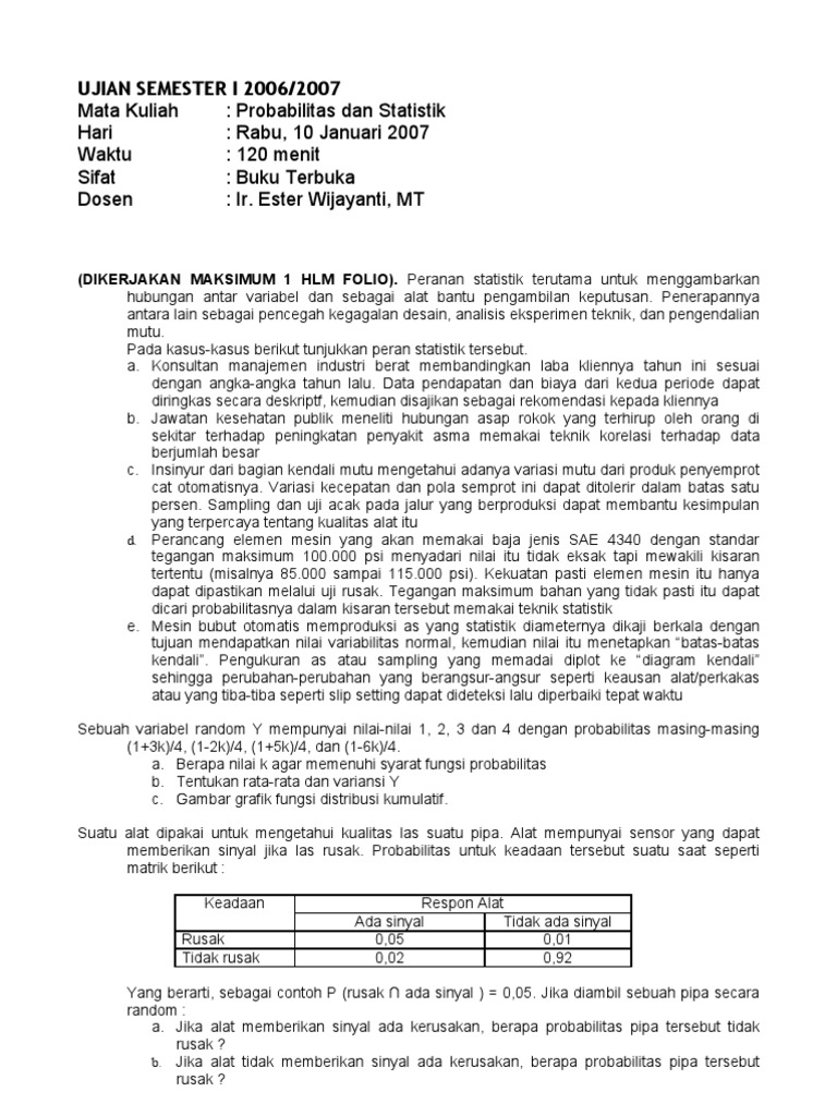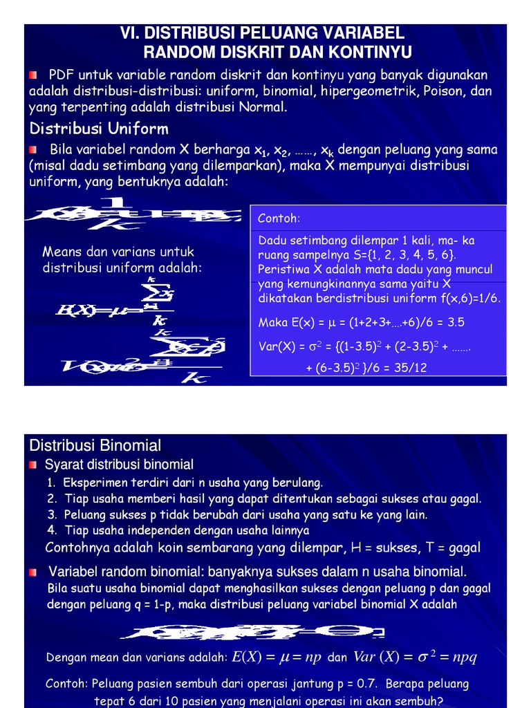 Contoh soal variabel random binomial. Karena nilai n berukuran besar dan p mendekati 12 maka distribusi binomial dapat dihampiri oleh distribusi normal dengan u np 20004 80 dan s 2 npq 2000406 48. Variabel acak diskrit berhubungan dengan hasil sebuah peristiwa yang ruang sampelnya terhingga dan terhitung. Pada penulisan kelima tentang statistika elementer ini penulis akan memberikan bahasan mengenai distribusi variabel acak diskrit untuk menambah pemahaman dan contoh soal mengenai variabel acak diskrit dan fungsi distribusinya.