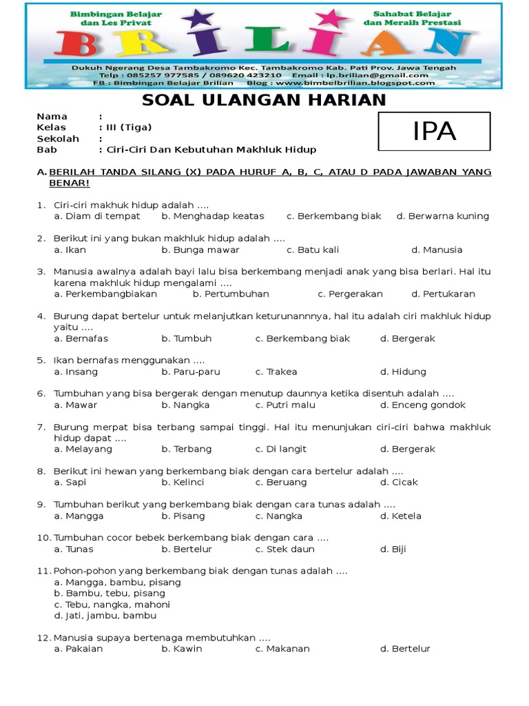 Soal Ciri-Ciri Makhluk Hidup Kelas 3 Sd. Cari jawaban kelas 3 sd tema 1, bagaimana cara ikan bernapas? Mar 25, 2021 · soal ipa kelas 3 sd bab ciri ciri dan kebutuhan makhluk hidup dan kunci jawaban 19 mei 2017 admin bimbel brilian 1 komentar a.