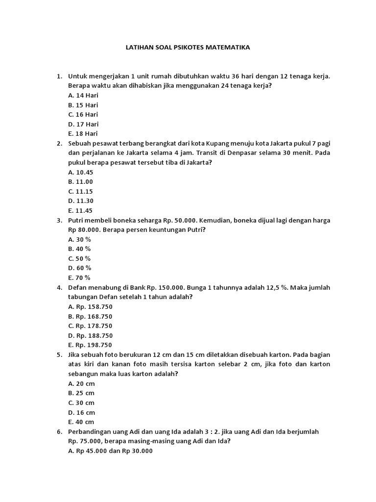 Soal Psikotes Matematika. Sebuah pesawat terbang berangkat dari kota kupang menuju kota jakarta pukul 7 pagi dan perjalanan ke jakarta selama 4 jam. Kumpulan soal psikotes matematika 1.